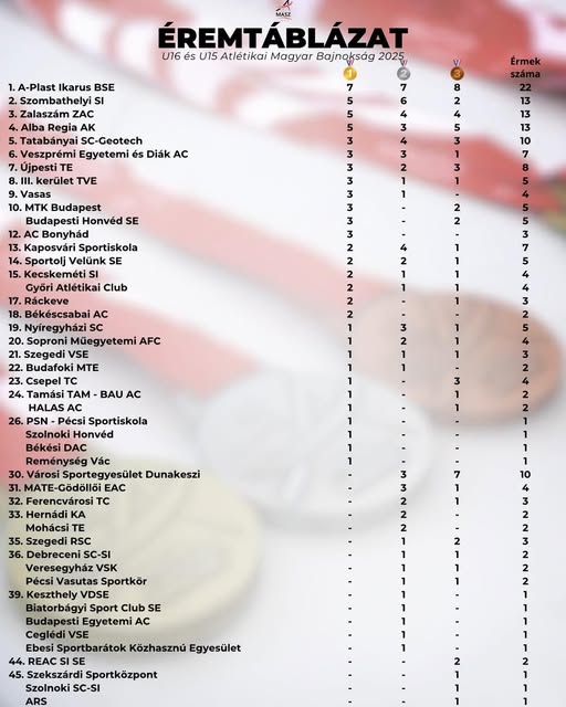A szezon utolsó egyesületi versenye az U15-U16 Országos Bajnokság volt. A hosszú év során 3 területi forduló alkalmával kvalifikálhatták magukat a korosztály sportolói. Több mint 30 atlétánk állt rajthoz sprint és dobószámokban. Óriási büszkeség hogy sportiskolásaink 5 arany, 6 ezüst, 2 bronzérmet szereztek az országos bajnokságon, ezzel az összesített éremtáblázaton 13 éremmel a fantasztikus második helyet szereztük meg.🥇🥈🥉